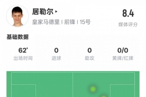 居勒尔本场数据:1造点4关键传球&传球成功率93.5%,评分8.4